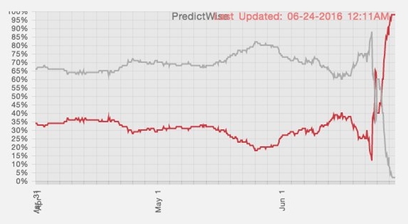 Figur 2: Bedömda vinstchanser för “Bremain” (grå linje) och “Brexit” (röd linje) fram till omröstningen 23 juni 2016.