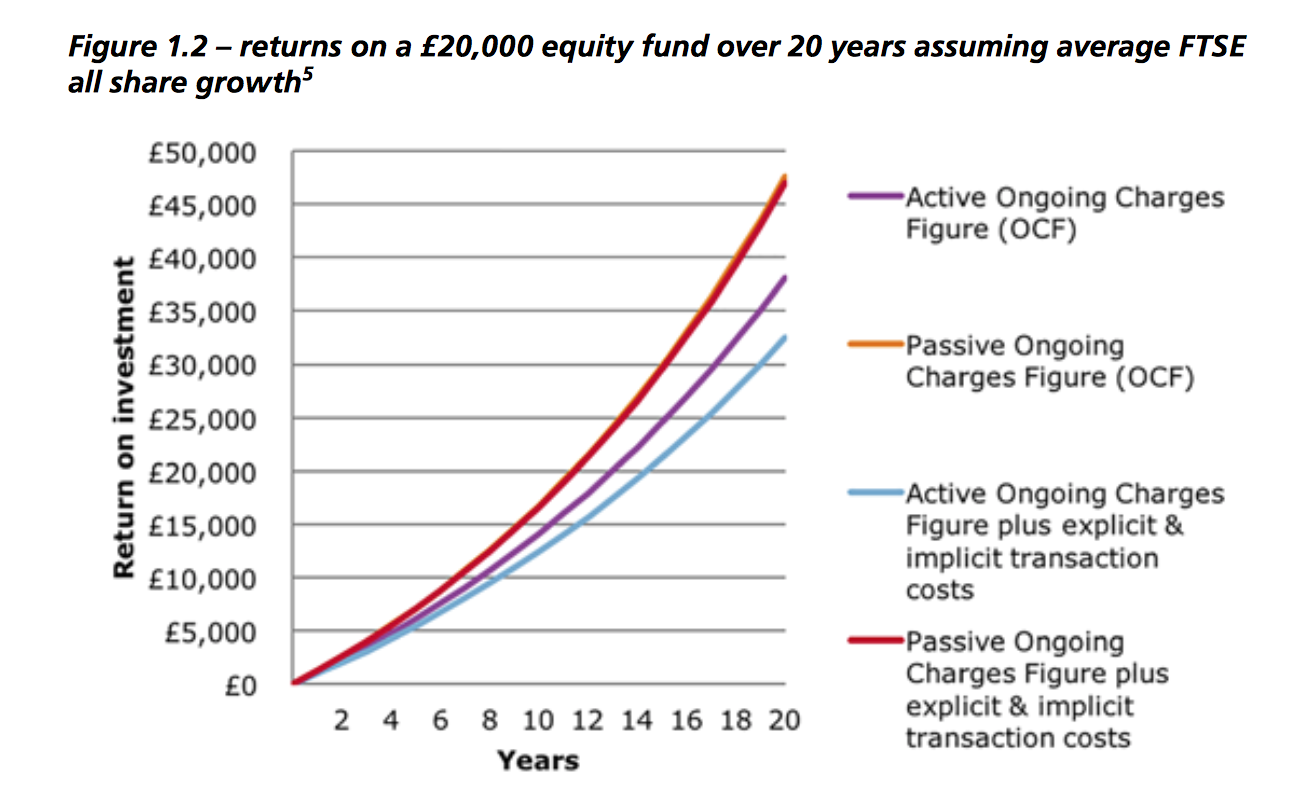 Den översta kurvan visar den absoluta nettoavkastningen (bruttoavkastningen minus avgifter) av en investering på GBP 20 000 för den genomsnittliga passivt förvaltade aktiefonden, den mellersta den absoluta nettoavkastningen för den genomsnittliga aktivt förvaltade fonden och den nedersta den absoluta  nettoavkastningen för den genomsnittliga aktivt förvaltade aktiefonden när även transaktionsavgifter dragits ifrån bruttoavkastningen. Det förutsätts att bruttoavkastningen är lika för aktiv och passiv förvaltning.