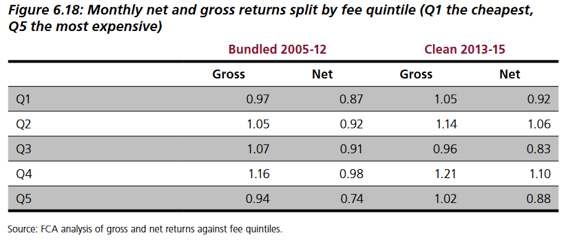 Nedanstående tabell visar att det knappast finns något samband mellan avgifter och avkastning. Fonderna är indelade i kvintiler där Q1 betecknar den femtedel av fonderna som har lägst avgifter. ”Bundled” betyder blandfonder och ”clean” rena aktiefonder. [Fel, begreppen avser hur kostnaderna tas ut från kunden, se kommentaren nedan.]