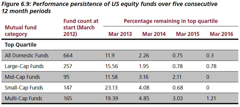 När det gäller frågan om vissa fonder kan uppvisa en uthållig avkastning (persistence) visar akademiska studier av den brittiska marknaden att så inte är fallet.  Nedanstående tabell visar att samma sak gäller den amerikanska aktiefondmarknaden.