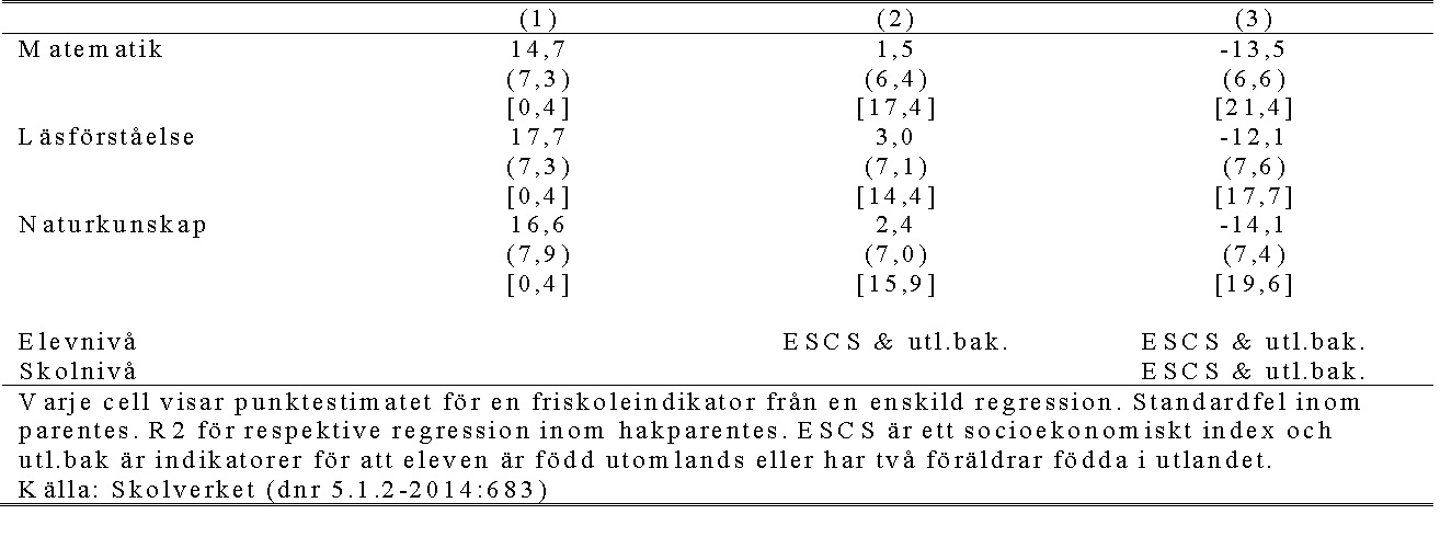 Sett till rena PISA-poäng så uppvisar friskolor bättre resultat än kommunala (kolumn 1 nedan). Resultatskillnader mellan skolor beror emellertid främst på vilka elever som går på skolorna och elevunderlaget skiljer sig markant mellan fristående och kommunala grundskolor. För att uttala sig om några mer djupgående skillnader i skolkvalitet måste därför hänsyn tas till elevunderlaget. I PISA-data finns ett index över elevernas sociala bakgrund (ESCS) samt indikatorer på deras eventuella utländska bakgrund som kan användas till detta syfte. En justering med hjälp av dylika indikatorer är bättre än inget, men de fångar knappast alla relevanta skillnader mellan elever; både barn till väletablerade diplomater och flyktingbarn med hackig skolgång bakom sig har ”utländsk bakgrund”. Även mellan elever med likartad social bakgrund finns en stor spridning i studieförmåga, motivation och intresse.
