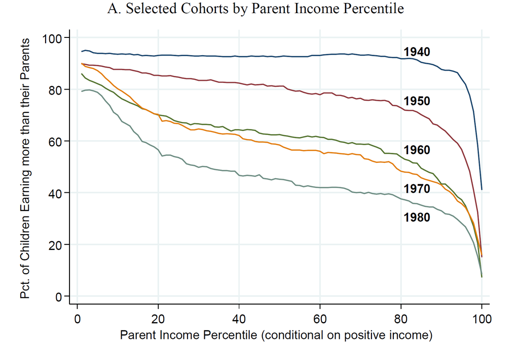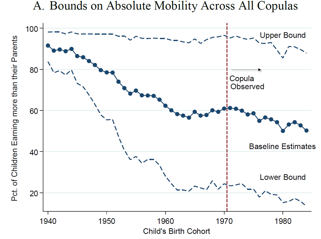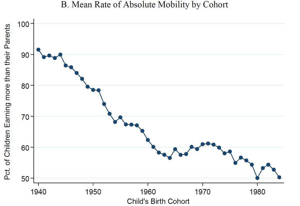 Författarna visar även utvecklingen över tid i form av den genomsnittliga andelen barn som tjänar mer än sina föräldrar. På den liggande är barnen sorterade utifrån deras födelseår. Bilden visar på en stadig nedgång i absolut inkomstmobilitet, med det största fallet mellan de tidiga 40-talistbarnen till de tidiga 60-talistbarnen. För senare 60-talister fram till tidiga 80-talister har utvecklingen varit stabilare med endast en försiktig nedgång från ca 60 procent till ca 50 procent.