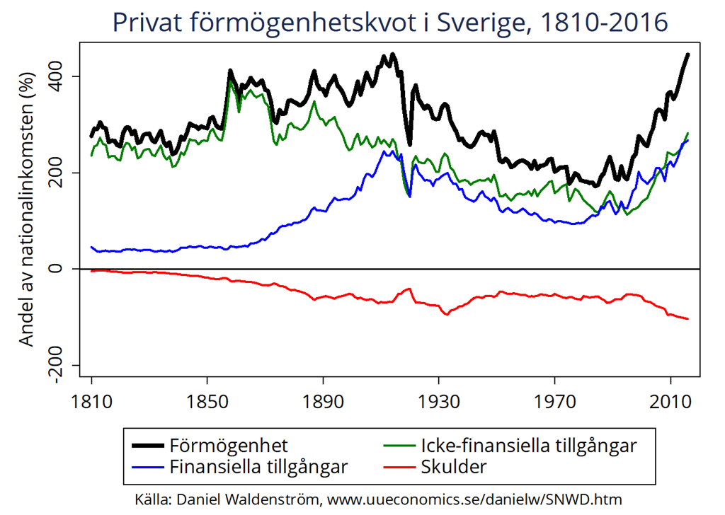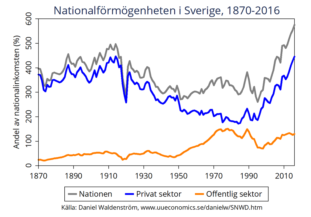 Sveriges samlade rikedomar kan mätas i nationalförmögenheten, dvs alla tillgångar minus skulder som ägs av hushåll, företag och offentlig sektor i vårt land. Nyligen presenterade SCB ny statistik över nationalförmögenheten sedan 1980, en statistik som EU beslutat ska finnas i alla medlemsländer som komplement till den redan existerande inkomststatistiken. I detta inlägg kopplas dessa nya siffror samman med en tidigare konstruerad historisk databas över nationalförmögenheten. Siffrorna visar att kapitalets storlek i förhållande till de samlade inkomsternas är större idag än det någonsin varit, att värdetillväxten främst återfinns i privat sektor.