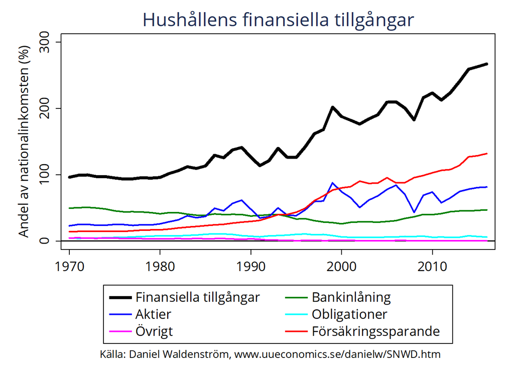 En närmare titt på hushållens finansiella tillgångar nedan visar att det är två tillgångsslag som ökat i värde: försäkringssparande och, i viss mån, aktier. Försäkringssparandet är till största delen fonderade pensioner, främst avtalspensioner. Dessa står idag för hälften av hushållens finansiella tillgångar, ett sällan uppmärksammat faktum. Till viss del finns en motsvarande minskning i de icke-fonderade (förmånsbaserade) pensionerna, vilket jag har konstaterat i en av mina studier.