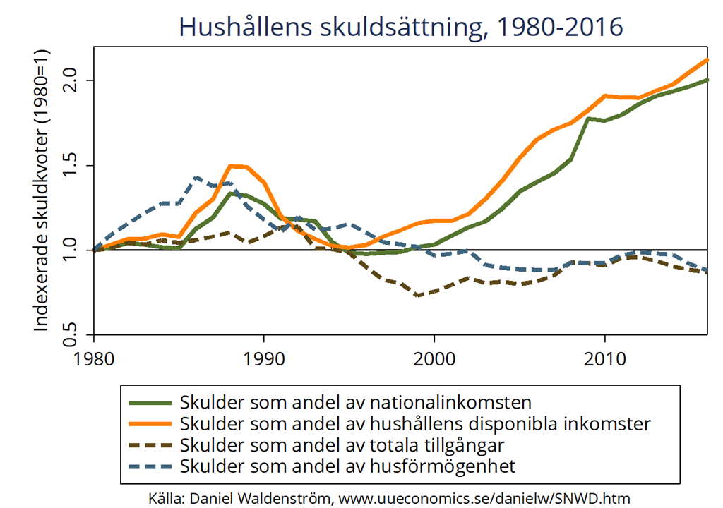 Frågan om hushållens belåning är omdiskuterad. Nationalförmögenhetsstatistiken ger följande bild under de senaste åren där fyra serier är indexerade till nivån år 1980. Om vi relaterar hushållens skulder till inkomster ser vi en relativ fördubbling sedan 1995. Om vi däremot relaterar till hushållens tillgångar, däribland husförmögenheten, ser vi att belåningsgraden inte ökat alls. Naturligtvis är dessa data inte tillräckliga för att avgöra om det finns en överskuldsättning eller inte eftersom det kräver en analys av hur stabila t ex huspriserna och hushållens inkomster är.