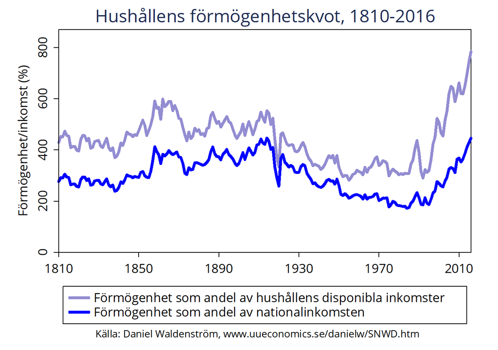 En annan bild av hushållens förmögenhetskvot över tid ges av att använda antingen nationalinkomsten eller hushållens disponibla inkomster i nämnaren. Jämförelsen med nationalinkomsten är mer rättvisande eftersom den tar hänsyn till alla de offentliga välfärdstjänster som vuxit fram under 1900-talet. Men oavsett nämnare ser vi hur stora rikedomar som vuxit fram inom privat sektor sedan 1990-talet fram till idag.