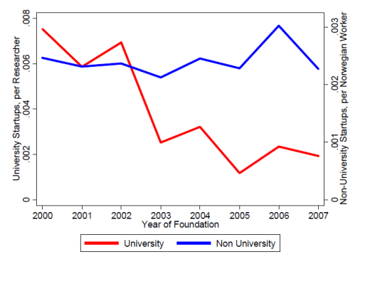 Men vilken av dessa effekter är starkast? Häromveckan hade vi besök av Ben Jones från Northwestern som studerat vad som hände när Norge år 2003 avskaffade sitt lärarundantag. Figuren nedan visar att antalet nya företag som startas av forskare knutna till högskolor och universitet minskade markant. I uppsatsen analyseras detta noggrannare och resultaten tyder på att reformen ledde till en halvering både av antalet nya företag och antalet patent. Dessutom går de företag som startas efter reformen sämre, och patenten har färre citeringar. Forskarna kan inte heller skönja att forskarna blev flitigare i sitt akademiska värv på grund av reformen — antalet akademiska publikationer påverkades inte.