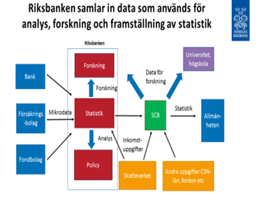Lösningen på detta problem heter naturligtvis förbättrad statistik, och just en sådan lösning föreslår nu Riksbanken i en ny promemoria. Banken vill bygga upp statistik över hushållens tillgångar och skulder genom att samla in uppgifter från banker och andra finansiella aktörer. Uppgifterna skickas därefter till SCB som kopplar samman dem med annan ekonomisk statistik (t ex över taxerade fastigheter, inkomster, familjekopplingar mm). Figuren nedan visar hur banken har tänkt sig att detta ska gå till.