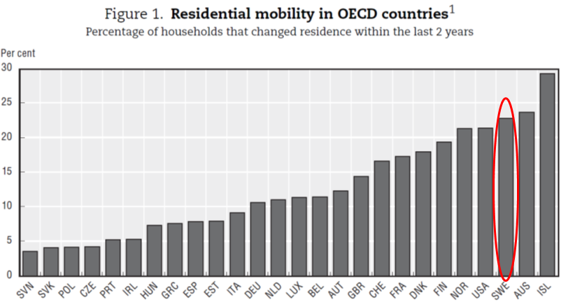 Är Sveriges bostadsmarknad trögrörlig? Detta är en svår fråga att besvara eftersom marknaden har flera olika segment (småhus, bostadsrätter, hyresrätter) och där dessa segment dessutom är olika sinsemellan gällande prisbildning (bl a pga hyresreglering) och grad av socialpolitiska inslag. OECD gjorde en 2011 ett försök att uppskatta och jämföra rörligheten på bostadsmarknaden i OECDs länder. Figuren nedan visar resultatet gällande rörligheten, mätt som andelen hushåll som bytt bostad de senaste två åren. Sverige ligger på tredje plats, med en andel på 23%, högt över de flesta andra OECD-länder. Orsakerna till att byta boende var ungefär desamma i Sverige som i andra länder, dvs till största del rent bostadsrelaterade och därefter kopplade till jobb- och familjeorsaker.