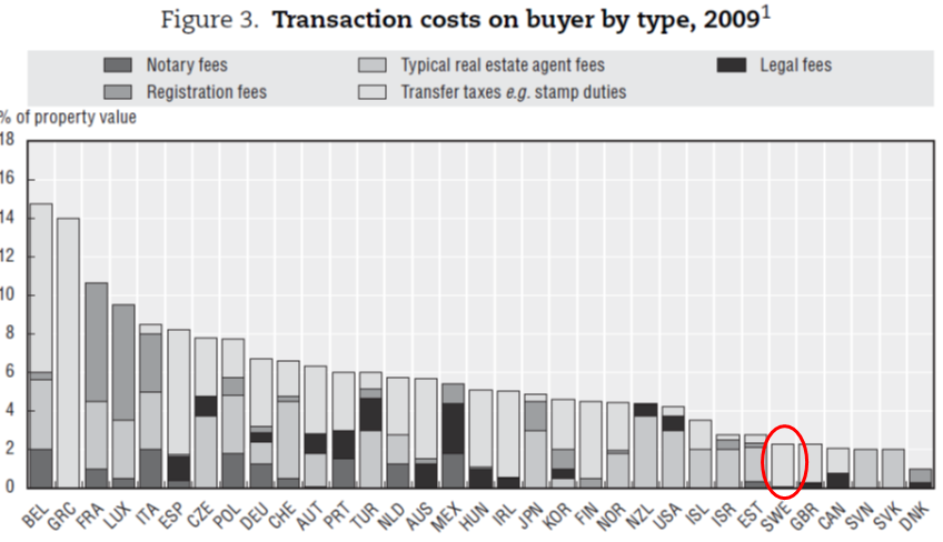 Flyttkostnaderna i Sverige är inte höga internationellt sett. Sverige har en ren “flyttskatt”: stämpelskatten på 1,5% av köpeskillingen som betalas av köparen (men som i normalfallet delas av köpare och säljare eftersom den kapitaliseras i priset). Till den kommer mäklararvode och i vissa fall pantbrevsavgift. Sammantaget är dock de omkostnaderna i Sverige bland de lägsta i OECD, vilket visas i följande figur (från samma OECD-studie).