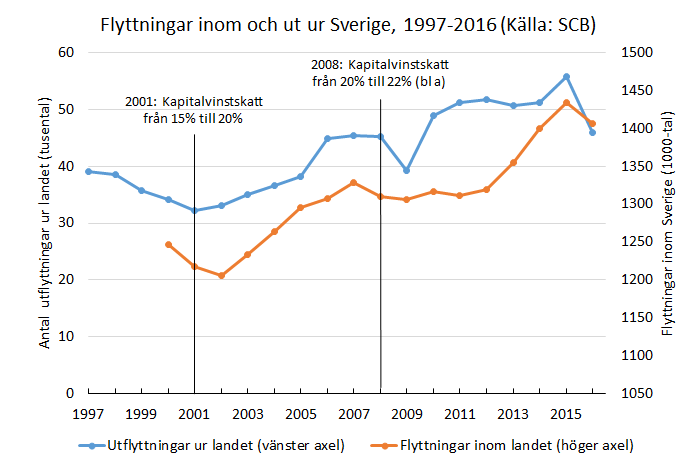 Ett första steg är att titta på den aggregerade flyttningsgraden inom Sverige över de senaste åren, vilket inte säger allting men ändå kan ge vissa indikationer om kapitalvinstskattens inverkan eftersom Sverige höjde denna skatt både 2001 (från 15% till 20%) och 2008 (från 20% till 22%). Noteras bör att andra saker skedde inte minst i samband med reformen 2008 som förändrade fastighetsbeskattningen genom införandet av ett skattetak som kraftigt sänkte på fastighetsskatten för relativt högt värderade småhus (framför allt i Stockholmstrakten). Bilden nedan visar data från SCB över antalet flyttningar inom Sverige och ut ur Sverige mellan åren 1997 och 2016. Sambandet med kapitalvinstskatt kan alltså inte härledas från en så aggregerad bild, men den ger i alla fall inte mycket stöd till att tidigare höjningar av kapitalvinstskatten medförde tydliga minskningar i människors vilja att byta bostad.