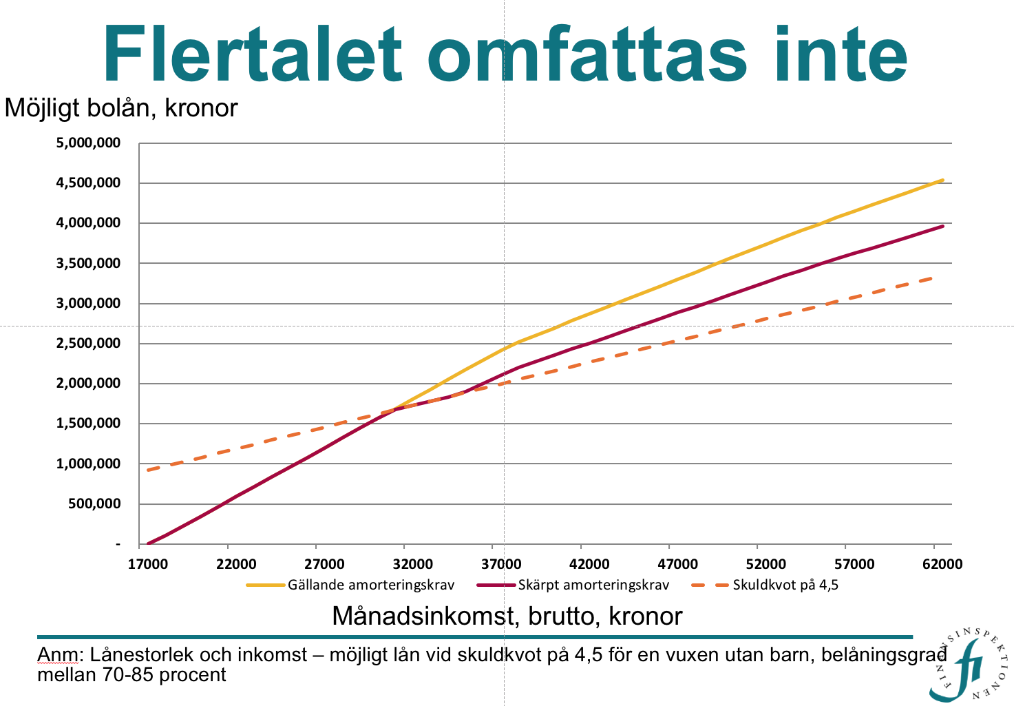 Vid en pressträff den 13 november 2017 presenterade Finansinspektionen sitt förslag om skärpt amorteringskrav, enligt vilket nya låntagare med bolåneskulder som överstiger 4,5 gånger bruttoinkomsten måste amortera minst 1 procent av skulderna utöver det gällande amorteringskravet. Där presenterades bl.a. nedanstående bild med rubriken ”Flertalet omfattas inte”, figur 1.