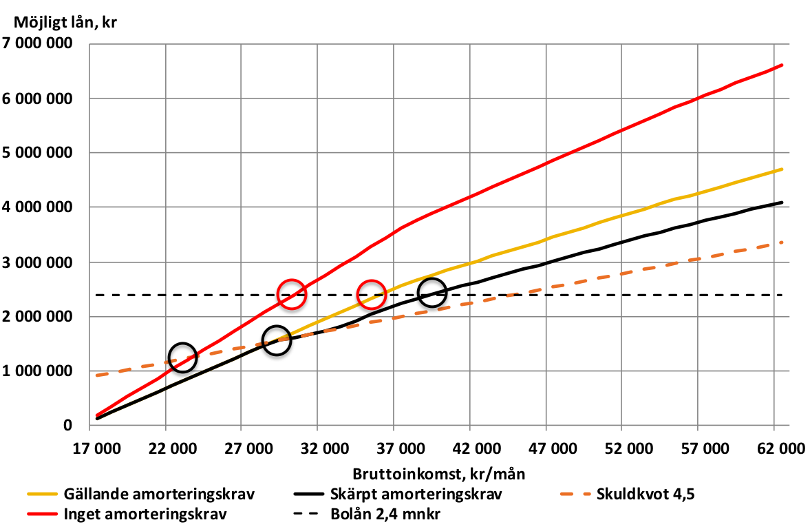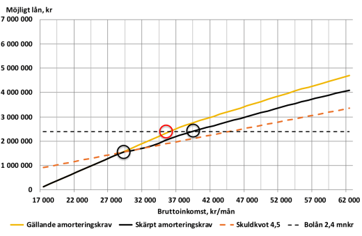 Utan amorteringar begränsar det skärpta amorteringskravet lånemöjligheterna redan för bruttoinkomster över 21 000 kr (den vänstra svarta cirkeln). Med det gällande amorteringskravet begränsar det skärpta amorteringskravet lånemöjligheterna för bruttoinkomster över 25 000 kr (den mellersta svarta cirkeln). Utan amorteringar krävs en bruttoinkomst över 27 000 (den vänstra röda cirkeln) för att få låna till den genomsnittliga ettan. Med det gällande amorteringskravet krävs en bruttoinkomst över 32 000 (den högra röda cirkeln), och med det skärpta amorteringskravet en bruttoinkomst över 35 000 kr (den högra svarta cirkeln).