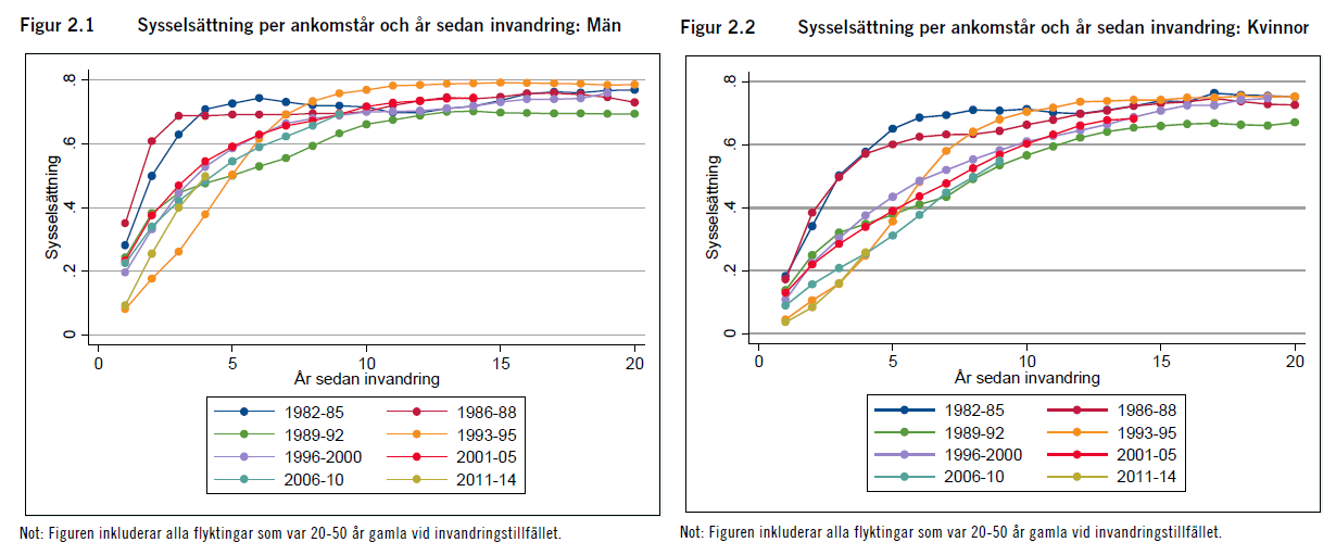 1. Ett resultat som rimmar väl med en IFAU-rapport från i fjol är att flyktingars långsiktiga sysselsättningsnivå varit väldigt stabil alltsedan 1980-talet. Integrationen gick dock betydligt snabbare på 1980-talet än under senare perioder. (Det kan skönjas en förbättring de allra senaste åren, vilket inte riktigt täcks av rapporten, men frågan är om inte det till stor del har konjunkturella orsaker.) Att mönstret är såpass stabilt är förvånande med tanke på att vilka ursprungsländer som dominerat förändras, att flyktingarna har tenderat att jobba i olika branscher (se figur 2.10-11 i rapporten) och att antalet flyktingar som kommit varierat mycket. Det är naturligtvis upplyftande att en större invandring inte behöver försämra arbetsmarknadsintegrationen, men samtidigt pekar stabiliteten också på att det är svårt att förbättra integrationen. Den politiska ambitionen att försöka förbättra integrationen har inte saknats och i den mån ambitionerna lett till politiska åtgärder är det svårt att skönja något som haft betydande effekt. Figurerna nedan illustrerar det historiska mönstret och visar sysselsättningen (definierat som 40 procent av medianinkomsten) för flyktingar som var mellan 20 och 50 år när de kom till Sverige under perioden 1982 till 2014 (klicka för högre upplösning).