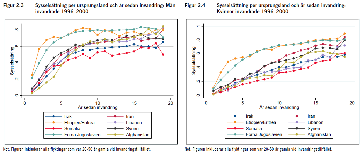 2. Det är slående stora skillnader mellan flyktingar från olika länder. Skillnaderna mellan olika ursprungsländer är också slående stabil över tid, och flera av skillnaderna förvånade åtminstone mig. Till exempel är en av de grupper det gått allra bäst av flyktingar från Etiopien och Eritrera (i skarp kontrast till grannlandet Somalia). Jag hade nog i stället tippat att flyktingar från Iran skulle ligga i topp, men de sticker inte ut åt något håll. Ruist gräver inte särskilt djupt när det gäller att förklara skillnaderna mellan olika grupper, men det vore intressant om andra tog vid och försökte besvara den frågan noggrannare. Figurerna nedan visar skillnader med avseende på ursprungsland för män respektive kvinnor som invandrade 1996-2000.