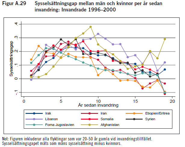 3. Sysselsättningsgapet mellan män och kvinnor är inledningsvis stort i alla flyktinggrupper. Men på lång sikt jämnas detta ut väsentligt och det gäller oavsett ursprungsland. Figuren nedan illustrerar sysselsättningsgapet för flyktingar som invandrade 1996-2000. På grund av det snäva årsintervallet är antalet observationer i en del grupper litet och linjerna är därför skakiga.