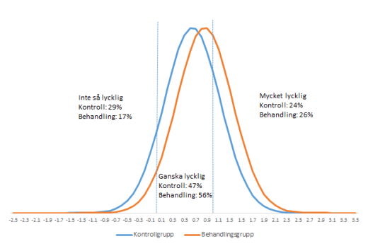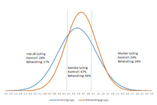 Den här figuren ser snarlik ut och medelvärdet är fortfarande högre i behandlingsgruppen. Men eftersom spridningen är större i kontrollgruppen, korsar de två normalfördelningskurvorna varandra bland de som är mycket lyckliga (ungefär vid 1,7 på x-axeln). Detta innebär att det nu antas finnas fler personer som är riktigt lyckliga (över 1,7) i kontrollgruppen än i behandlingsgruppen. Annorlunda uttryckt innebär detta att bland de som svarat ”mycket lycklig” är det fler i kontrollgruppen som är riktigt lyckliga (över 1,7). Detta skulle till exempel kunna bero på att experimentet gjorde de flesta lyckligare, men att behandlingen hade negativa effekter för de som redan var väldigt lyckliga.