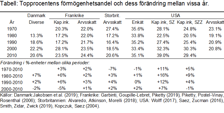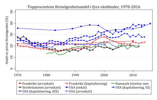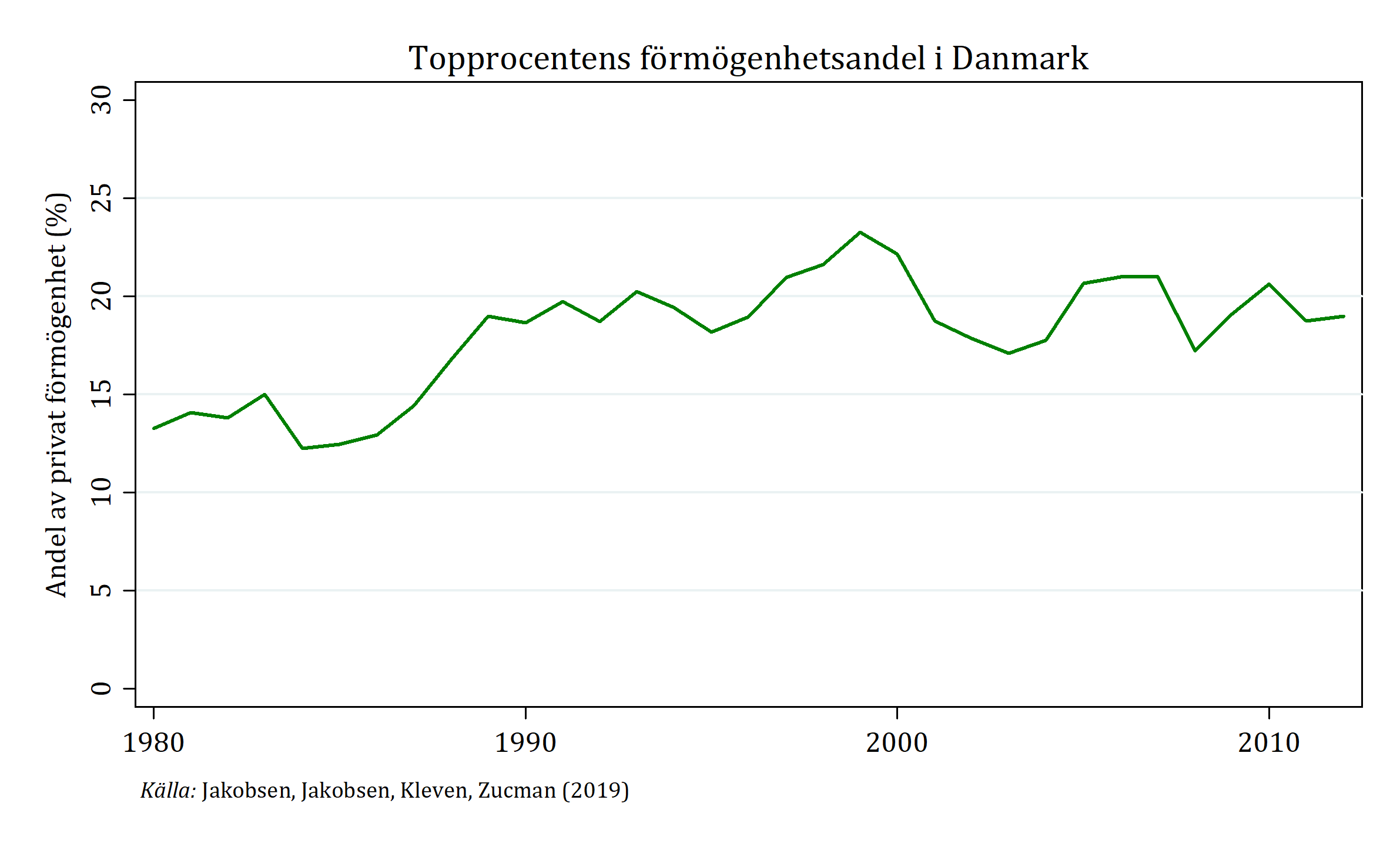 Danmark: I en studie av förmögenhetsskattens betydelse för kapitalbildning byggde en grupp danska och franska ekonomer en ”modern” förmögenhetsdatabas baserad på individuella registerdata över tillgångar och skulder (vilken bevarades även efter den danska förmögenhetsskattens avskaffande 1996). Utifrån dessa data beräknades topprocentens andel som visas i figuren nedan. Serien visar att andelen låg kring 15 procent på 1980-talet och har legat konstant kring 20 procent sedan 1990. Med andra ord: ingen ökning i förmögenheternas koncentration i Danmark under de senaste decennierna.