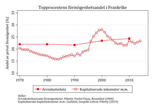 Utvecklingen för Frankrikes topprocent kan därför beskrivas i två parallella serier, en som bygger på arvskattedata och en som bygger på kapitaliserade kapitalinkomster. Bilden nedan visar att dessa metoder genererar serier som inte är helt olika varandra men inte heller helt stämmer överens, framför allt när det gäller fluktuationer över tid men även i viss mån när det gäller nivån. Arvskattedata visar på en närmast konstant andel mellan 22 och 25 procent medan kapitaliseringsdata visar en lägre nivå under 1970- och 80-talen (15-20 procent), något högre kring år 2000 och därefter samma nivå mellan 22 och 24 procent. En viss ökning i koncentrationens nivå i Frankrike sedan 1970 kan alltså skönjas när man betraktar kapitaliserade inkomstdata men inte när man betraktar arvsskattedata. Sett över hela perioden är dock serierna hyfsat överens om att nivån ligger i hägnet kring en topprocentsandel på ca 20 procent.