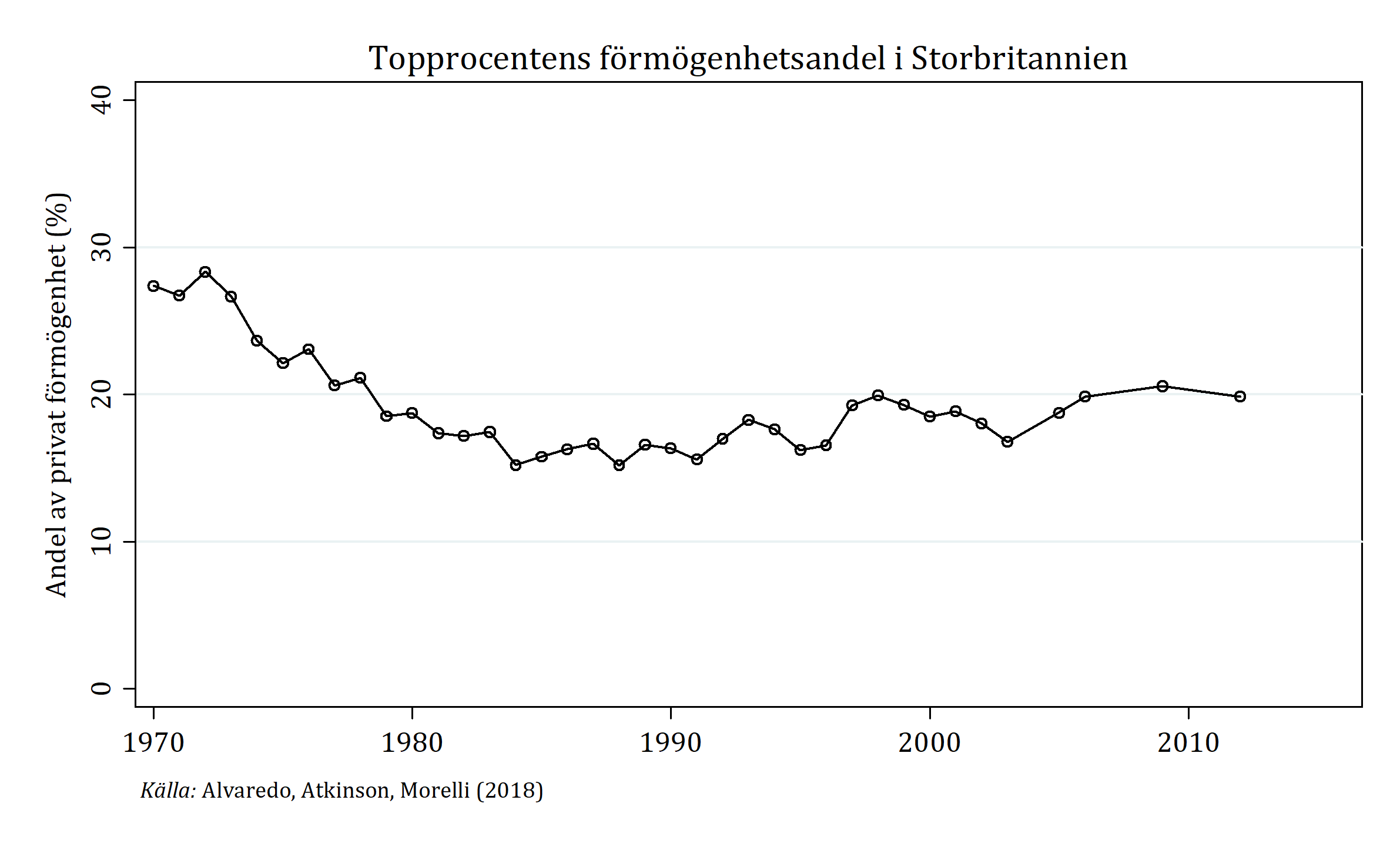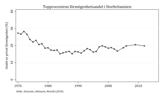 Storbritannien: Arvsskattedata (kvarlåtenskaper) ligger till grund för nästan alla försök att uppskatta förmögenhetskoncentrationen i Storbritannien. Den senaste och förmodligen bästa studien diskuterar utförligt för- och nackdelar med data och hur känsliga de är för olika antaganden. Serien i bilden nedan visar en förhållandevis kraftig utjämning under 1970-talet och att topprocentens andel legat nästan konstant på 20 procent sedan 1980.