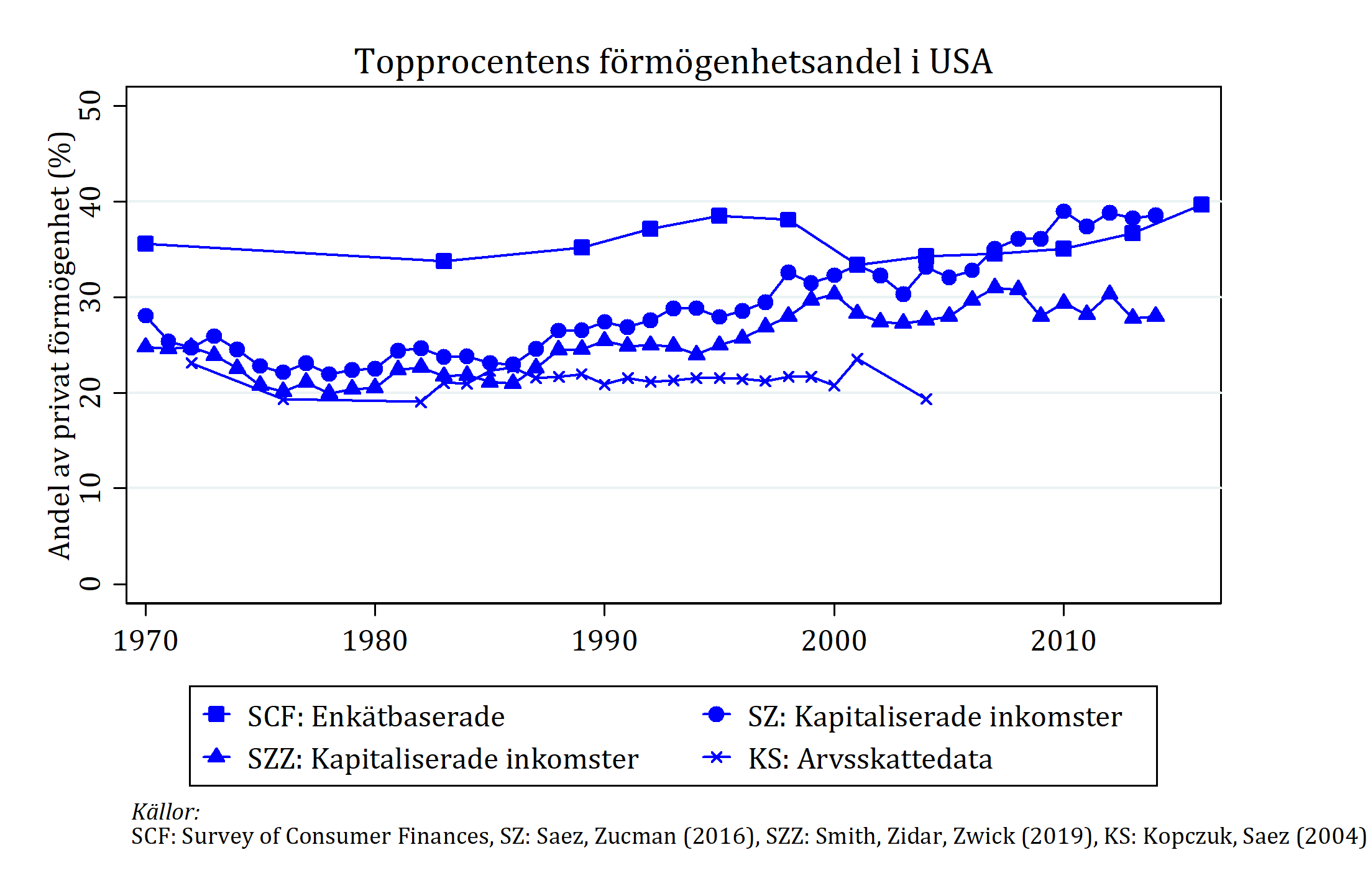 USA: Förmögenhetskoncentrationen i USA har fram till för några år sedan nästan uteslutande beskrivits utifrån den stora enkätundersökning, Survey of Consumer Finances (SCF), som Federal Reserve genomför vart tredje år. En studie av arvsskattedata kom 2004. Som figuren nedan visar båda dessa att förmögenhetskoncentrationen legat stabilt sedan 1970-talet, kring 35 procent i SCG och kring 20 procent i arvskattedata. Denna stabilitet har ansetts överraskande med tanke på att inkomsternas fördelning blir mer ojämn sedan 1980-talet (något som dock också har diskuterats).