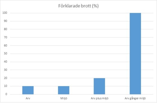 Jag tycker det är lite luddigt formulerat eller någon form av cirkelresonemang, Om alla brott begås av de i miserabla miljöer kommer ju miljö förklara 100 % av brotten? Det samma gäller arv, om endast de med benägenhet begår brott så förklarar den också 100% av brotten. Stapeldiagrammet och texten måste ju avse frekvensen av brottslingar i populationen el dylikt, inte redan begångna brott?