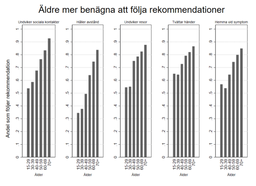 Frivilligheten i den svenska smittskyddsstrategin är omtvistad. Det tycks som om svenskarna – och framförallt de äldre – tagit till sig rekommendationer om social distansering. Om det är tillräckligt är ännu för tidigt att avgöra och vår studie kan inte sprida ljus över denna fråga, som bäst besvaras av smittskyddsexperter. Däremot kan vi utvärdera åtgärdernas påverkan på människors välbefinnande i ekonomiska termer.