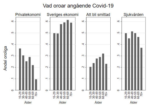 Men vår data visar också att den största oron kopplad till coronapandemin inte rör den egna risken att smittas. Det som oroar svenskarna mest är hur det skall gå för landets ekonomi och hur sjukvården skall klara av anstormningen av sjuka. Medan oron för hur det skall gå med landets ekonomi tenderar att öka med åldern, så minskar rädslan för att sjukvårdens kapacitet ska överskridas med åldern och i betydande utsträckning för de över 70 år. Även oron för viruset påverkan på den egna ekonomin verkar avta med ålder.