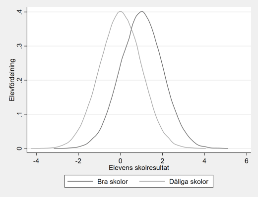 Detta illustreras i figuren ovan som kommer från en övning där 100 000 elever antas ha normalfördelade studieförutsättningar. Eleverna slumpas ut på 1000 skolor där hälften av skolorna bidrar med en standardavvikelse (motsvarande 70 meritpoäng) bättre skolresultat än resten. Spridningen i de individuella studieförutsättningarna är emellertid stor och även i detta hypotetiska skolväsende skulle 80 procent av den totala resultatspridningen hänföras till dessa.