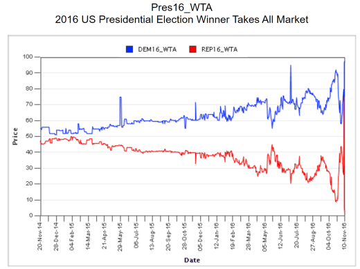 Men det finns ett problem: samma presidentvalsmarknad år 2016 visade en övertygande seger för senator Hillary Clinton över Donald Trump så sent som dagen före valet. Alltså togs inte enbart experter och opinionsinstitut på sängen, utan även prediktionsmarknaderna! Denna bild visar handeln i terminerna för Clinton och Trump den gången. Orsaken till dessa felbedömningar sedan dess diskuterats ymnigt (även på Ekonomistas).