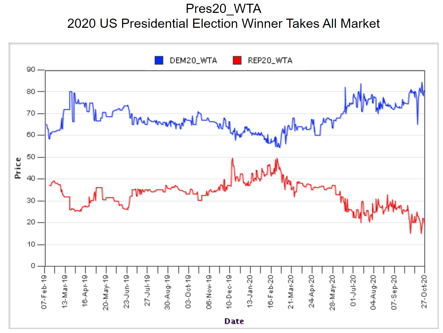 Iowa Electronic Markets visar att terminen som ger betalt i en Bidenseger (blå linje) kostar 80% av sitt fulla värde (om han skulle förlora valet blir terminen värdelös). Trumpterminen (röd linje) är värd 20%, vilket alltså visar en att Bidens segerchans är fyra gånger större än Trumps enligt denna marknad.