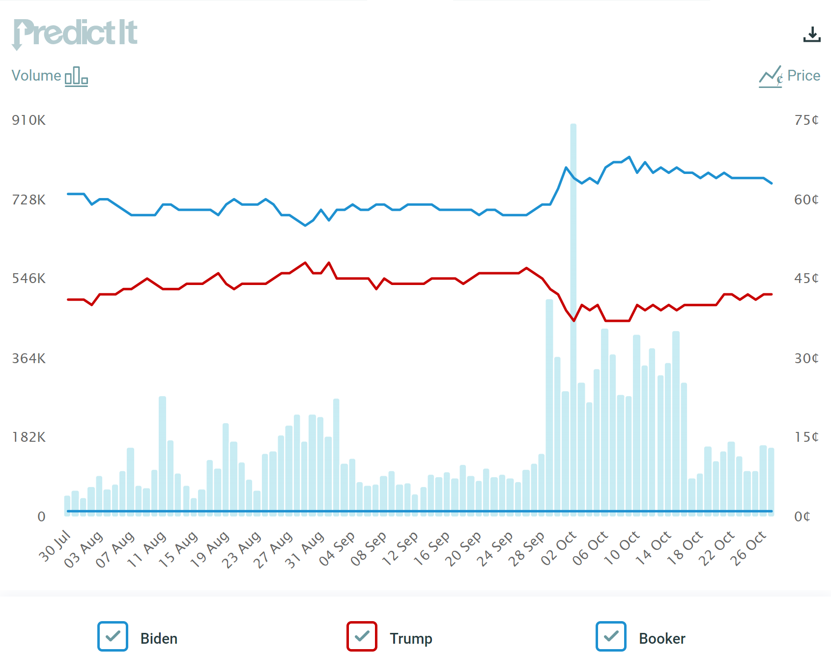 Predictits marknad visar liknande tendens, men med något mindre skillnad i bedömd seger chans, ca 60-40 i Bidens favör.