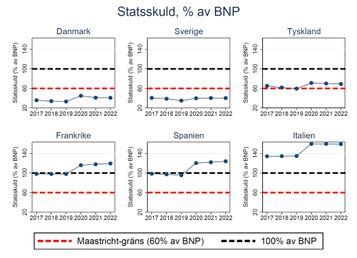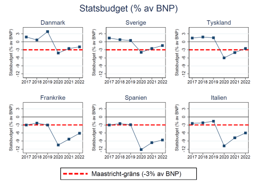 I Maastrichtavtalet 1992 sattes en övre gräns för statens budgetunderskott på 3% av BNP. Tanken var att detta skulle förhindra att regeringarna bedriver alltför expansiv och kortsiktig politik. Gränsen har visserligen överskridits av alla EU-länder vid enstaka tillfällen, men den dramatiska budgetförsämring som Coronanedstängningarna har lett till är oöverträffade under alla år sedan Maastrichtavtalets tillkomst.
