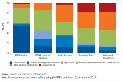 Det är förstås också inom naturresurssektorn man hittar nästan alla så kallade oligarker. Andelen miljardärer som tjänat sina pengar på politiska kontakter och naturresurser är exceptionellt hög just i Ryssland. Diagrammet nedan är från EBRDs Transition Report 2016 och illustrerar i vilken utsträckning de verkligt stora förmögenheterna i öst, förstås helt dominerat av Ryssland, är knutna till naturresurser. Storleken på dessa förmögenheter i relation till BNP är dessutom större i Ryssland än någon annanstans, drygt 25 procent, med undantag för Georgien där de är över 35 procent. (Grafik och beräkningar tagna ur EBRDs Transition Report 2016 här).