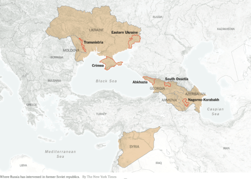 I ljuset av båda dessa förklaringar kan kriget ses som en fortsättning – om än oväntat aggressiv – på en politik som förts under lång tid. Ett huvuddrag i denna har bestått i att upprätthålla och skapa så kallade ”frusna konflikter” i länder som man betraktat som del av den ryska intressesfären. Den med längst historia är den ofta bortglömda i den nordligaste delen av Moldavien i området Transnistrien. Detta område som i det internationella samfundets ögon tveklöst är en del av Moldavien styrs i praktiken autonomt av en ryskstödd lokalregering och det har sedan 1990-talet funnits rysk militär närvaro i området (dock inte av en omfattning som gjort detta strategiskt viktigt i konflikten i Ukraina). Andra områden som också har en historia sedan Sovjetunionens kollaps är de Georgiska områdena Abchazien och Sydossetien. Dessa områden behandlades på många sätt precis som Krim och de östra delarna av Ukraina 2014, när Ryssland invaderade Georgien 2008. De angivna ryska anledningen i båda fallen var att ”skydda” den rysktalande befolkningen och stödja utropandet av självständiga utbrytarrepubliker. Eftersom detta förfarande förstås inte är sättet på vilket nationer bildas i den internationella rättsordningen blir konsekvensen dock att områden fortsatt är delar av Moldavien, Georgien och Ukraina, men att de i praktiken i olika utsträckning styrs av Ryssland. (Se karta från NYT nedan över dessa områden hämtad här). Detta i sin tur försvårar förstås för dessa länder att diskutera till exempel EU-medlemskap i ett läge när de inte ens kontrollerar sitt eget territorium. Om Rysslands intresse är att förhindra just den typen av diskussioner så är den frusna konflikten ett utmärkt sätt att uppnå detta.