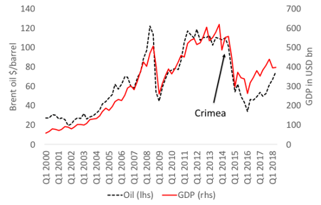 Om det övergripande målet nu är att få ett antal länder att orientera sig mot Ryssland, varför agera militärt? Det är förstås en mångfasetterad fråga men några grundförutsättningar kanske ändå finns att hämta i vilka relativa styrkor man har. Ryssland är som bekant fortsatt en militär stormakt som dessutom har fler kärnvapen än något annat land (över 6000). De har också enorma naturtillgångar i form av olja, naturgas, diverse mineraler och metaller och även stora jordbruksarealer. Samtidigt är Rysslands ekonomi globalt sett ganska liten. Räknat i marknadsvärden är EUs sammanlagda BNP ungefär 10 gånger så stort som Rysslands. USAs är ungefär 13 gånger så stort. Rysk ekonomi är dessutom väldigt ensidig i termer av att den är så extremt beroende av naturresursexport. Sett över den period då Putin varit president kan Rysslands ekonomiska tillväxt till stor del (60-85 procent av BNP fluktuationer) förklaras av en enda variabel, oljepriset. (Den vaksamme kan notera att det ser ut att vara misstänkt stora svängningar i BNP, men siffrorna är korrekta. Fluktuationerna beror på att rysk BNP här är uttryckt i USD och en stor del av variationerna kommer ifrån växelkursförändringar. Se fördjupningar om detta här och här)