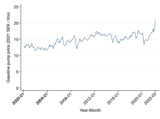 Figur 1: Bensinpris vid pump (2021 SEK/liter)