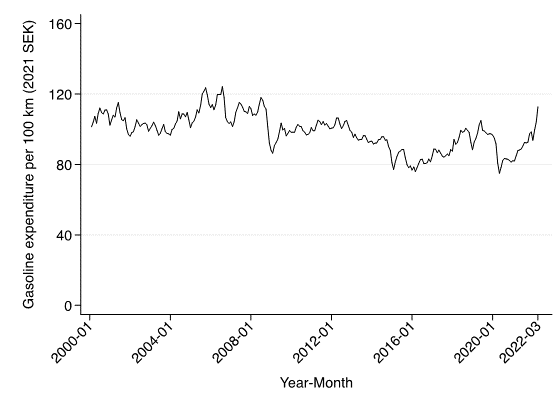 Den historiskt stora sänkningen  motiveras av ett historiskt högt bensinpris. Figur 1 visar det per månad genomsnittliga reala bensinpriset i Sverige från 2000 till mars 2022. Priset har ökat under de senaste 20 åren. Om man går ännu längre tillbaka i tiden är priset i dag högre än vid någon tidpunkt sedan 1960. Svenska hushåll betalar alltså mer för en liter bensin än någonsin tidigare. Priserna i diagrammet inkluderar energiskatt, koldioxidskatt och mervärdesskatt. Före skattesänkningen i år var den kombinerade skattesatsen för energi- och koldioxidskatten 6,82 kronor per liter bensin. Om man lägger till den moms som tillämpas på dessa skatter, som uppgår till 1,71 kronor, får man en total punktskatt på 8,53 kronor. Detta belopp är fast på kort sikt och varierar inte med förändringar i oljepriset.
