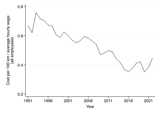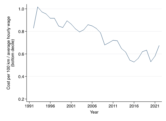 För det andra ökar hushållens inkomster över tid. Den genomsnittliga reala timlönen har ökat med nästan 40 procent mellan 2000-2022. Figur 3 visar att kostnaden för att köra en viss sträcka, mätt som andel av hushållsinkomsten, har sjunkit stadigt över tid. Figur 4 visar att detta gäller även de 10 procent av hushållen med lägst inkomster. År 1991, när koldioxidskatten infördes, behövde ett genomsnittligt hushåll spendera omkring två tredjedelar av en timlön för att kunna köra 100 km. År 2020 behövde samma hushåll bara lägga ut en tredjedel av en timlön för att köra samma sträcka. Kostnaderna för att köra bil har ökat under de senaste två åren, men det är fortfarande billigare i dag att köra en viss sträcka i förhållande till inkomsten jämfört med något år före 2012.
