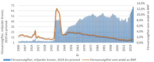 Figur 1: Sveriges officiella försvarsutifter 1900-2021 (Källa: FOI).