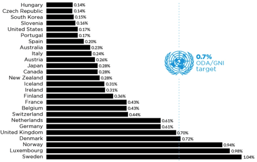 Sverige har långa och stolta traditioner av att vilja hjälpa fattiga länder med bistånd och hjälp i annan form. Oavsett vad man anser om biståndet sticker Sverige ut internationellt sett. Vi har valt en unik strategi (som vi endast delar med Norge) där regeringen låser fast biståndsbudgeten till 1% av BNP. (Förslaget om att ge 1% av sina inkomster är dock gammalt). Figuren nedan (hämtad här) visar Sverige ligger på toppnivå bland världens rika länder. Medelnivån i de rika ländernas klubb, OECD, är hälften så stor (Finland ger 0,3% av BNP, Danmark 0,7%).