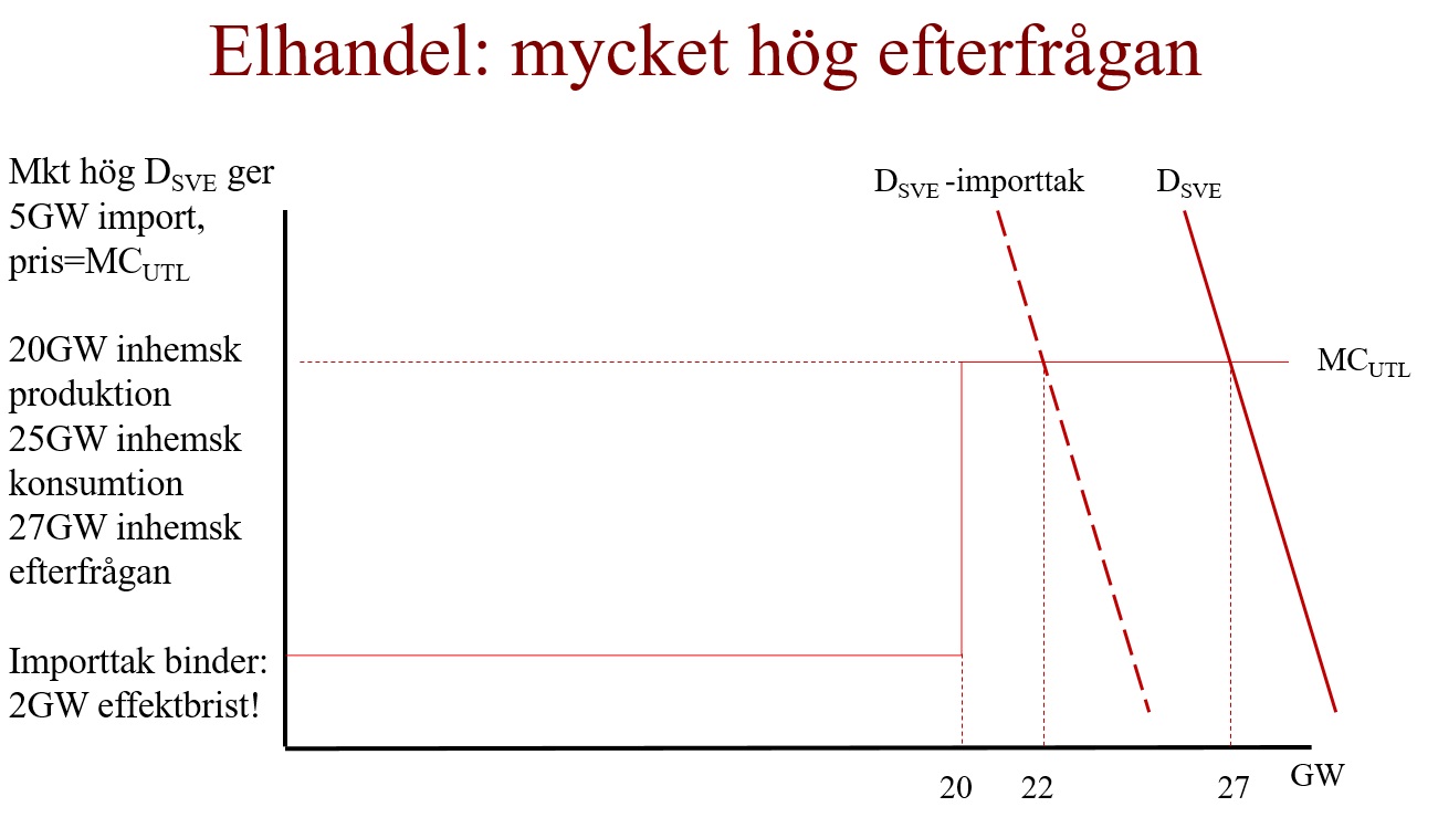 Sverige är inte alltid exportör av el utan ibland är den inhemska efterfrågan så hög att produktionskapaciteten inte räcker till. Motsvarande situation kan även uppstå om den inhemska produktionskapaciteten är låg, exempelvis när det blåser lite eller då kärnkraftsreaktorer är stängda för underhåll. Kablarna används i detta fall för import och i situationen som illustreras nedan utgör deras kapacitet inte någon begränsning. Priset är högt och även i detta läge gör de inhemska producenterna stora vinster.