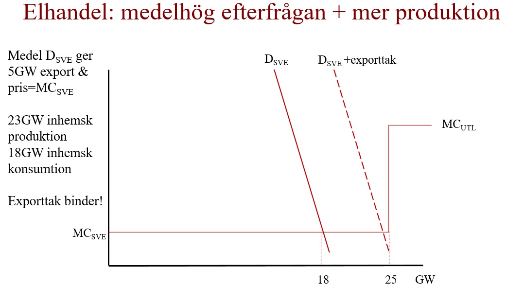 När den inhemska efterfrågan är högre finns mindre utrymme för export och kablarna utgör i detta läge inte någon begränsning för elhandeln. Istället slår den inhemska produktionskapaciteten i taket. Eftersom producenterna kan välja att sälja dyrt i omvärlden snarare än billigt i Sverige bestäms priset av den högre utländska marginalkostnaden. De inhemska producenterna gör i situationen som visas nedan stora vinster då priset ligger långt över produktionskostnaderna. Åtgärder för minskad efterfrågan kan i detta läge få stort genomslag på priserna om åtgärderna får exporttaket att åter binda.