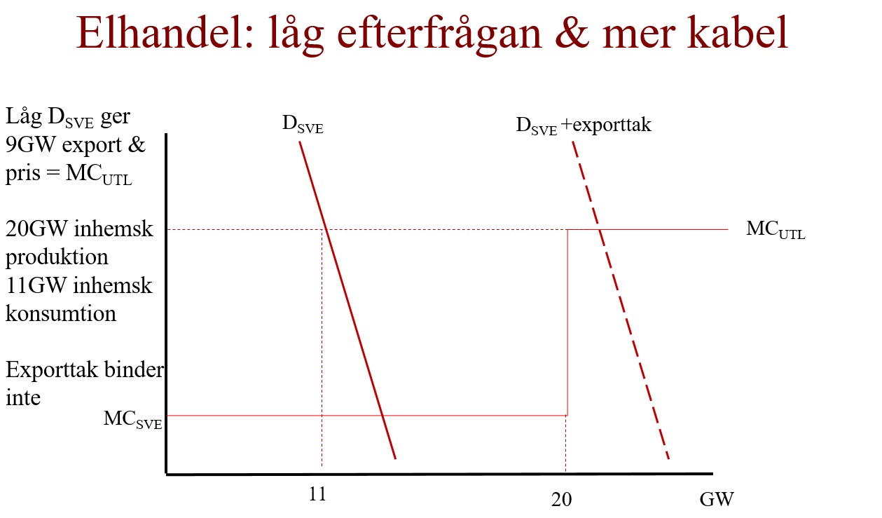 Den första situationen är en där den svenska efterfrågan, DSVE, är låg och exporten slår därför i kablarnas kapacitetstak. Även om producenterna säljer så mycket de kan på exportmarknaden så finns det produktionskapacitet över vilket gör att det inhemska priset motsvarar den låga marginalkostnaden. I praktiken fungerar därför den begränsade kabelkapaciteten som ett handelshinder som skyddar den inhemska marknaden från omvärldens högre priser.