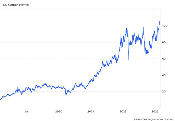 2. Även om priset ökat snabbt är det knappast i absoluta tal jättehögt, utan i storleksordningen 1 kr per kg CO2, vilket t ex motsvarar ca 2,3 kr per liter bensin.