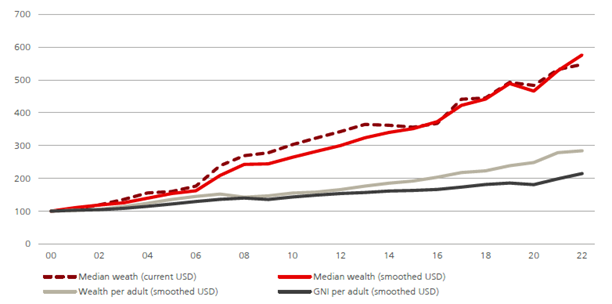 Diagram 1: Globala trender i medianförmögenhet, förmögenhet per vuxen och BNP per vuxen 2000-2022 (2000=100).