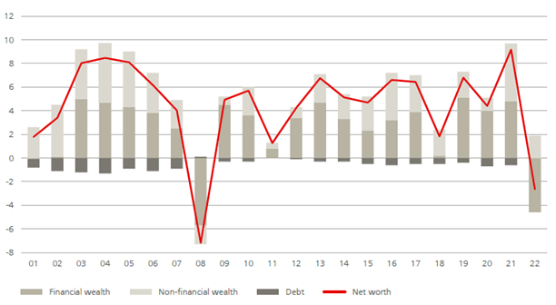Diagram 2: Årlig förändring i nettoförmögenhet och dess komponenter (%), 2000-22.