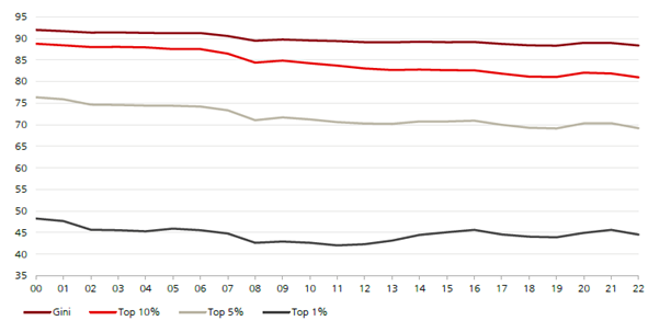Diagram 3: Globala trender för ojämlikhet i förmögenhet, 2000-2022.