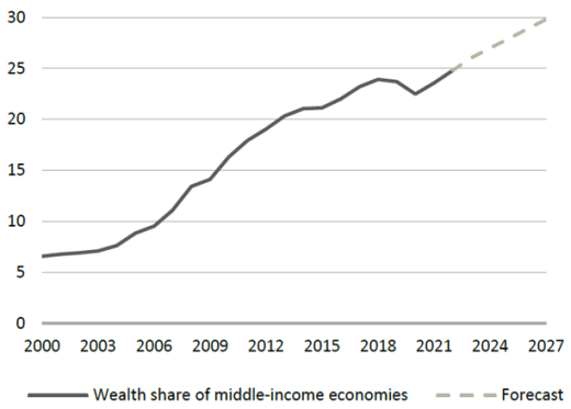 Medelinkomstländer, eller ”tillväxtekonomier”, har bidragit starkt till den globala förmögenhetsökningen sedan början av detta århundrade och framför allt till minskningen av den globala ojämlikheten. Som en Mellan 2000 och 2022 mer än tredubblades tillväxtekonomiernas förmögenhetsandel, från 7% till 25%. Diagram 5 visar denna utveckling och våra prognoser antyder att utvecklingen kommer att fortsätta under de kommande fem åren. Vi förväntar oss att den globala medelklassen kommer att växa med 268 miljoner vuxna till år 2027, vilket innebär en ökning till nästan 37% av världens vuxna.