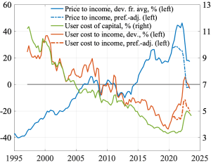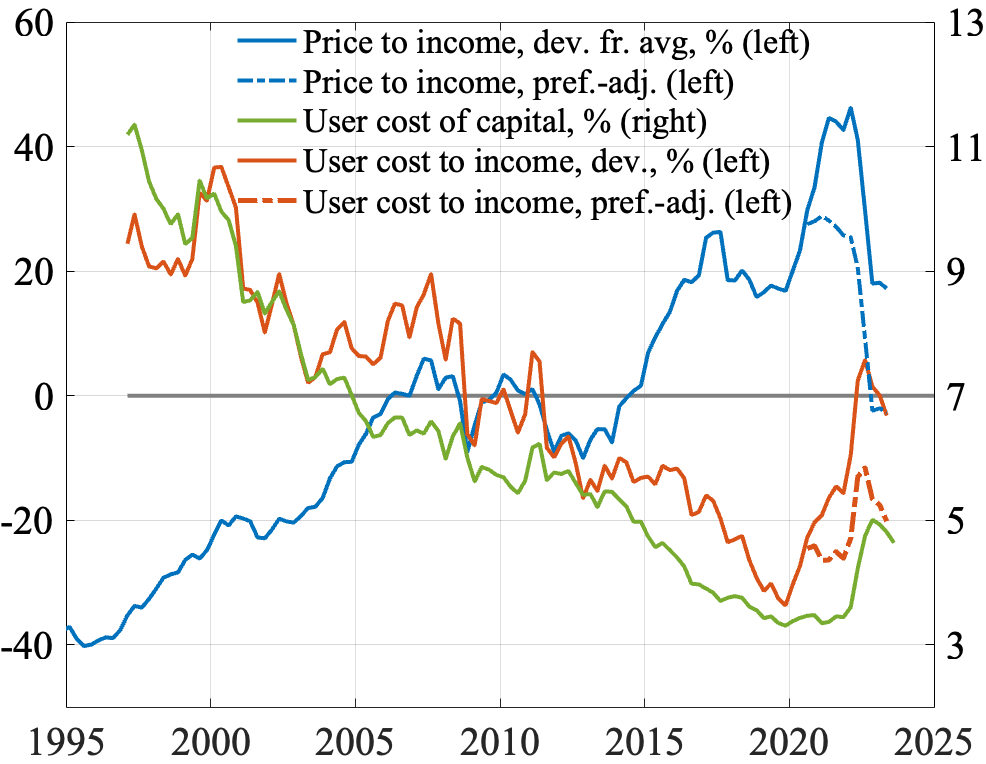 Detta resulterar i den streck-prickiga blå kurvan för den preferensjusterade priskvoten och den streck-prickiga röda kurvan för den preferensjusterade brukarkostnadskvoten. Enligt denna var bostäderna fortfarande undervärderade med 20 procent i kvartal 2 i 2023.